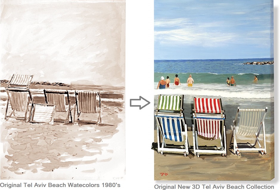 The original 3D Beach Chairs of Tel Aviv artworks are based on an early watercolors that were crated by Arie Azene during the 1980’s.