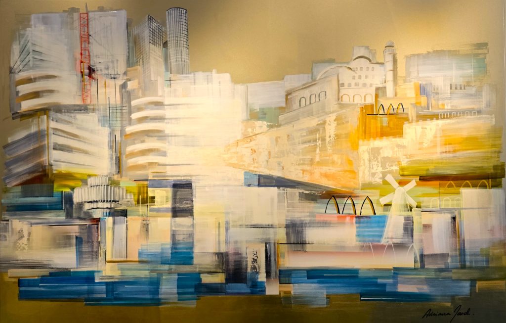 With her signature use of lacquered aluminum and palette knife technique, Naveh creates a shimmering surface that seems to breathe with movement. Her portrayal of Jerusalem is not literal but emotional—imbued with reverence, memory, and personal connection. Birds soar above the whitewashed buildings, offering a sense of peace and transcendence.