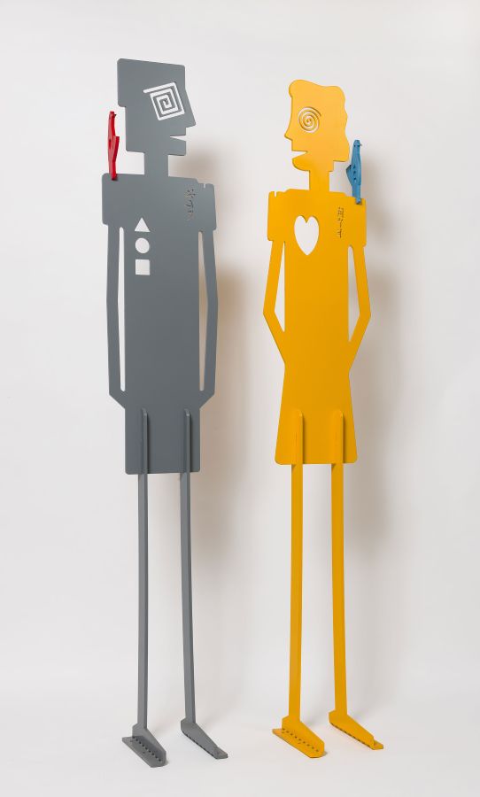A striking and unique 3D sculpture titled ‘Adam & Eve’, crafted with original automobile colors on aluminum. Each piece stands at approximately 203 x 35 cm (Eve) and 206 x 35 cm (Adam), making them suitable for both indoor and outdoor display. This artwork is a fusion of pop art and modern art influences, drawing inspiration from the Bauhaus movement, pop art icons, and ancient scripts. This piece reflects the artist distinctive style and storytelling passion, bridging the past and present, making it a special and exciting addition to any collection.