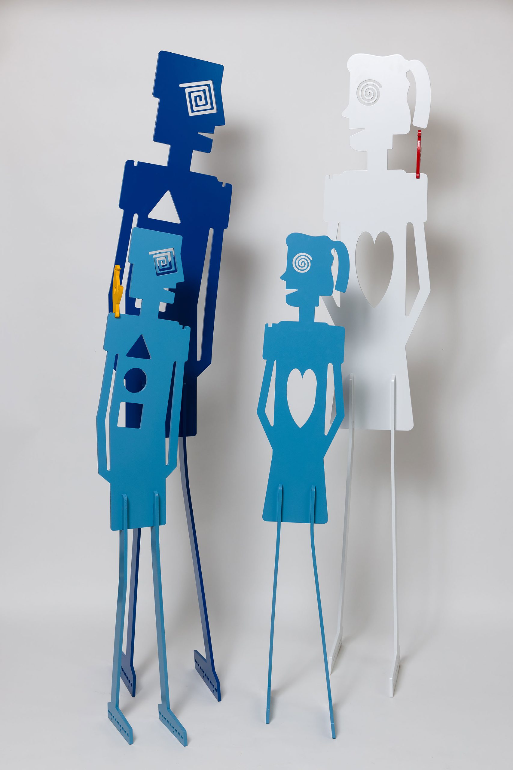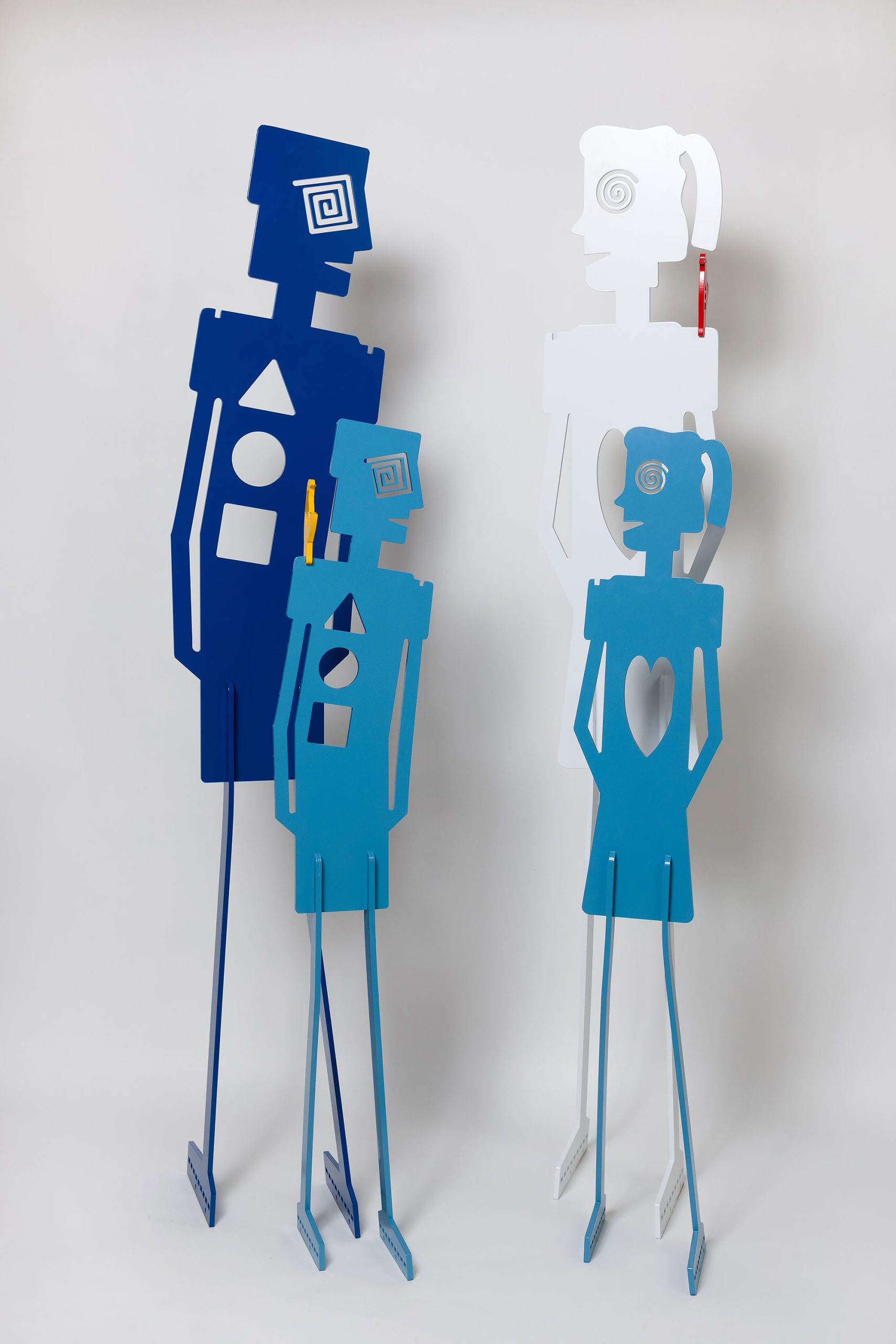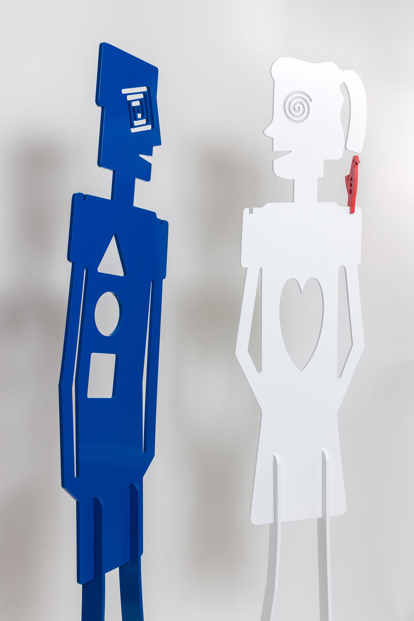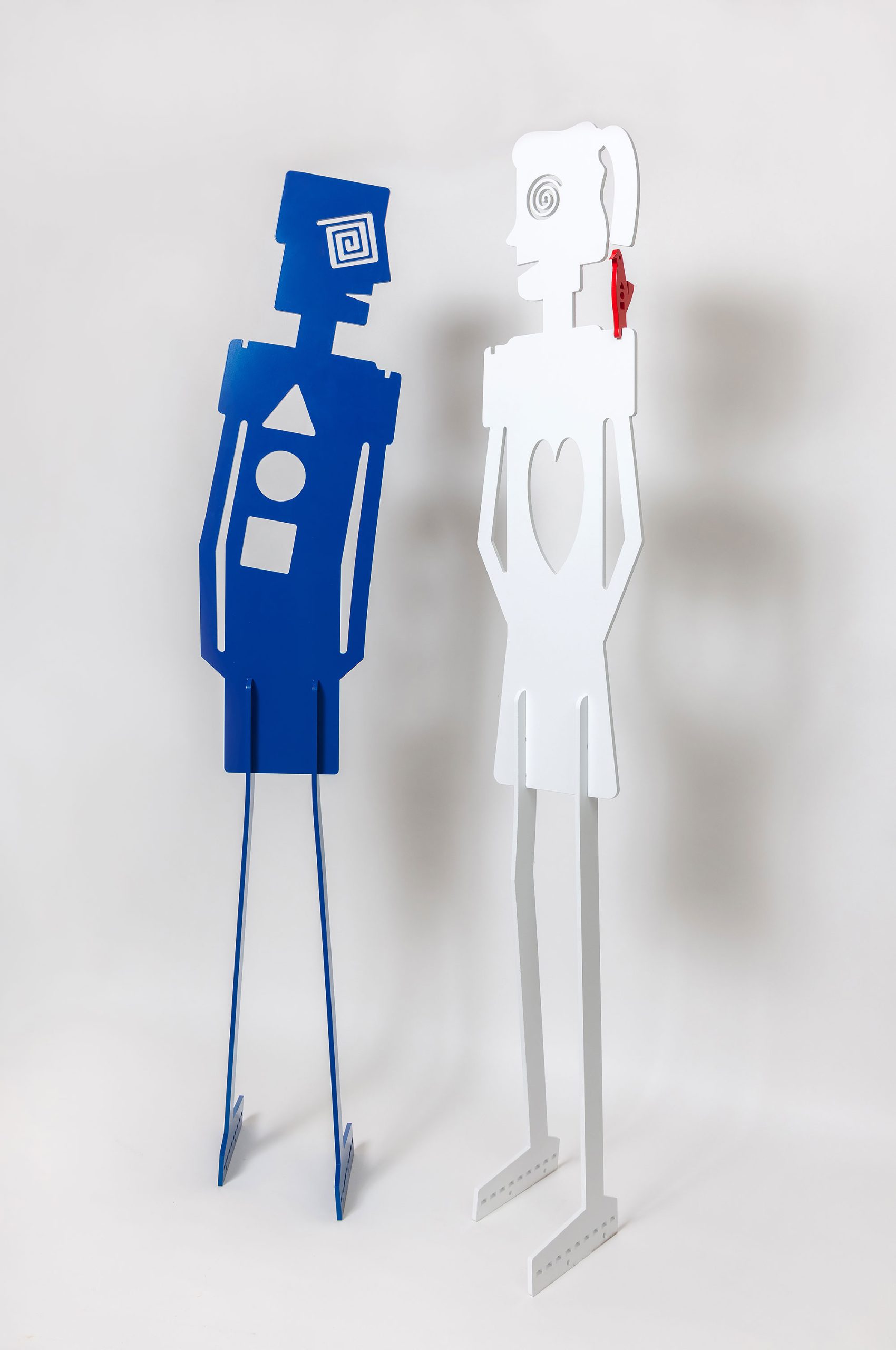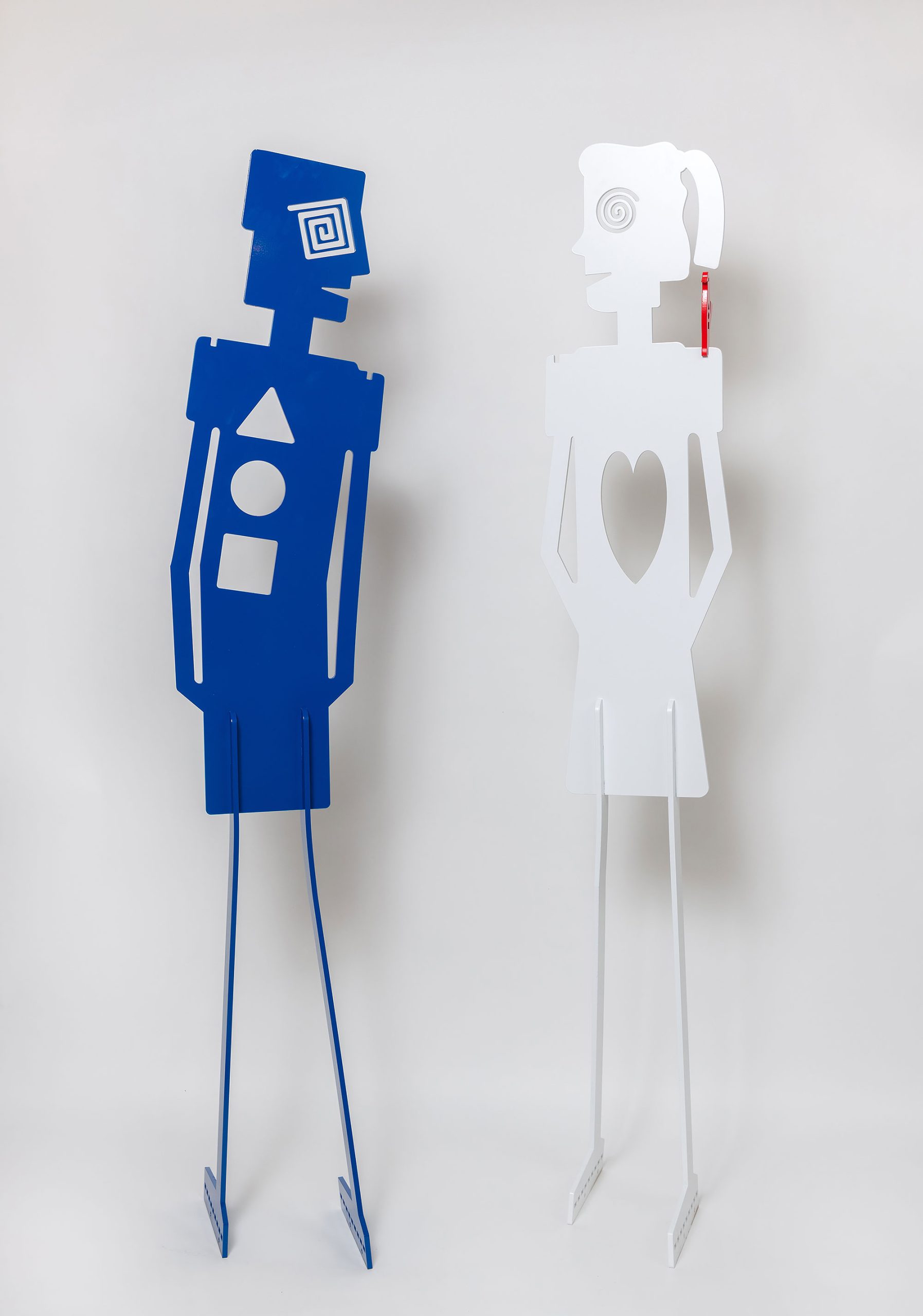 A striking and unique 3D sculpture titled ‘Adam & Eve’, crafted with original automobile colors on aluminum. Each piece stands at approximately 203 x 35 cm (Eve) and 206 x 35 cm (Adam), making them suitable for both indoor and outdoor display. This artwork is a fusion of pop art and modern art influences, drawing inspiration from the Bauhaus movement, pop art icons, and ancient scripts. This piece reflects the artist distinctive style and storytelling passion, bridging the past and present, making it a special and exciting addition to any collection.