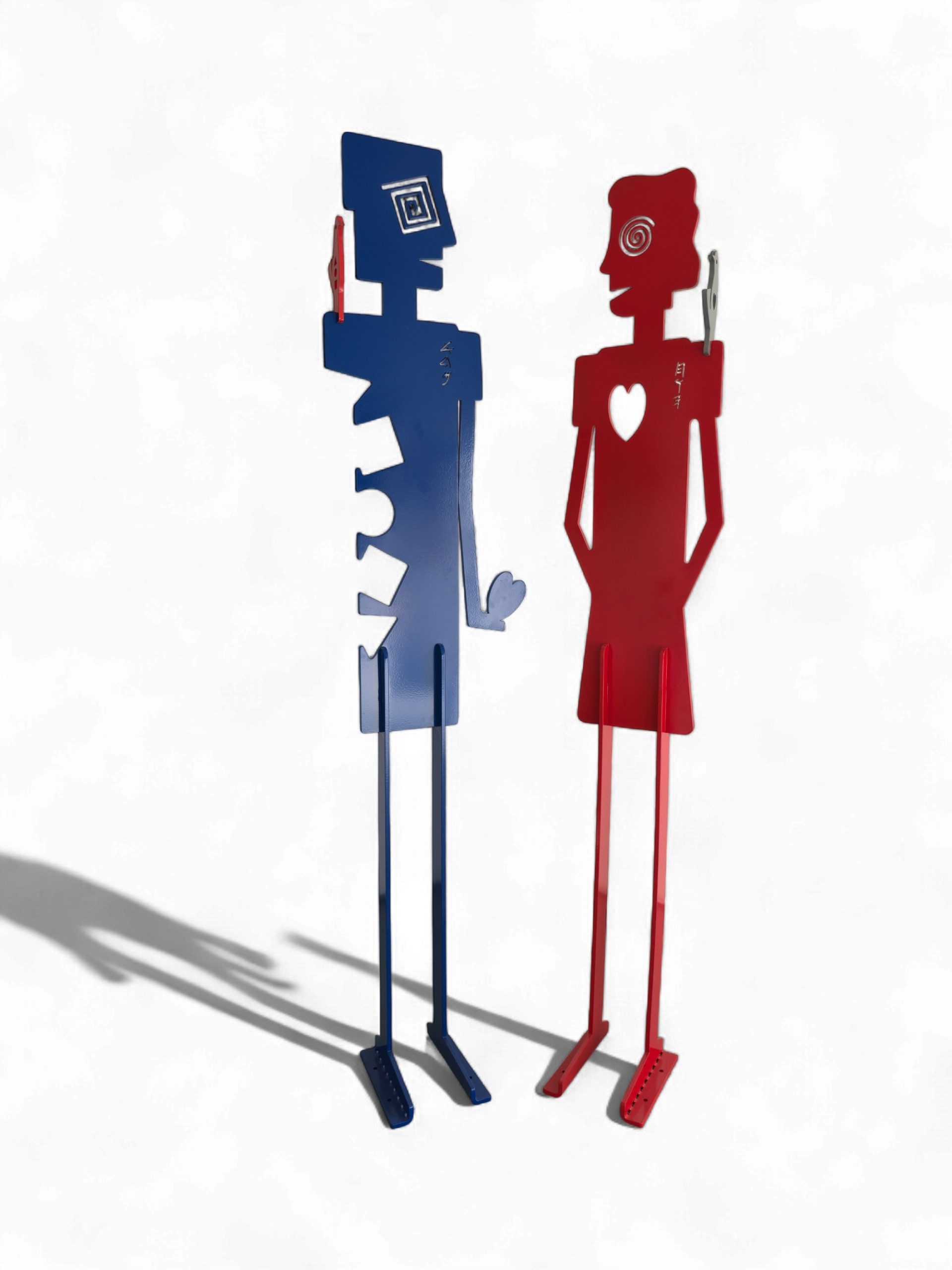 A striking and unique 3D sculpture titled ‘Adam & Eve’, crafted with original automobile colors on aluminum. Each piece stands at approximately 203 x 35 cm (Eve) and 206 x 35 cm (Adam), making them suitable for both indoor and outdoor display. This artwork is a fusion of pop art and modern art influences, drawing inspiration from the Bauhaus movement, pop art icons, and ancient scripts. This piece reflects the artist distinctive style and storytelling passion, bridging the past and present, making it a special and exciting addition to any collection.