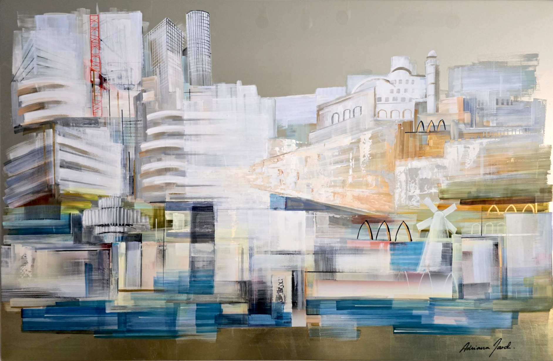 In Jerusalem of Gold , Adriana Naveh reimagines the timeless city through a contemporary lens, blending spiritual symbolism with urban abstraction. Layers of metallic sheen and luminous color wash across the aluminum surface, evoking Jerusalem’s golden hues, its layered history, and its ever-shifting light. Stylized architectural motifs—arches, domes, windows—float across the canvas in rhythmic harmony, suggesting a cityscape at once ancient and modern, grounded and ethereal.