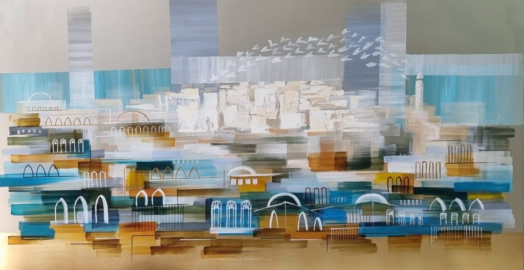 With her signature use of lacquered aluminum and palette knife technique, Naveh creates a shimmering surface that seems to breathe with movement. Her portrayal of Jerusalem is not literal but emotional—imbued with reverence, memory, and personal connection. Birds soar above the whitewashed buildings, offering a sense of peace and transcendence.
