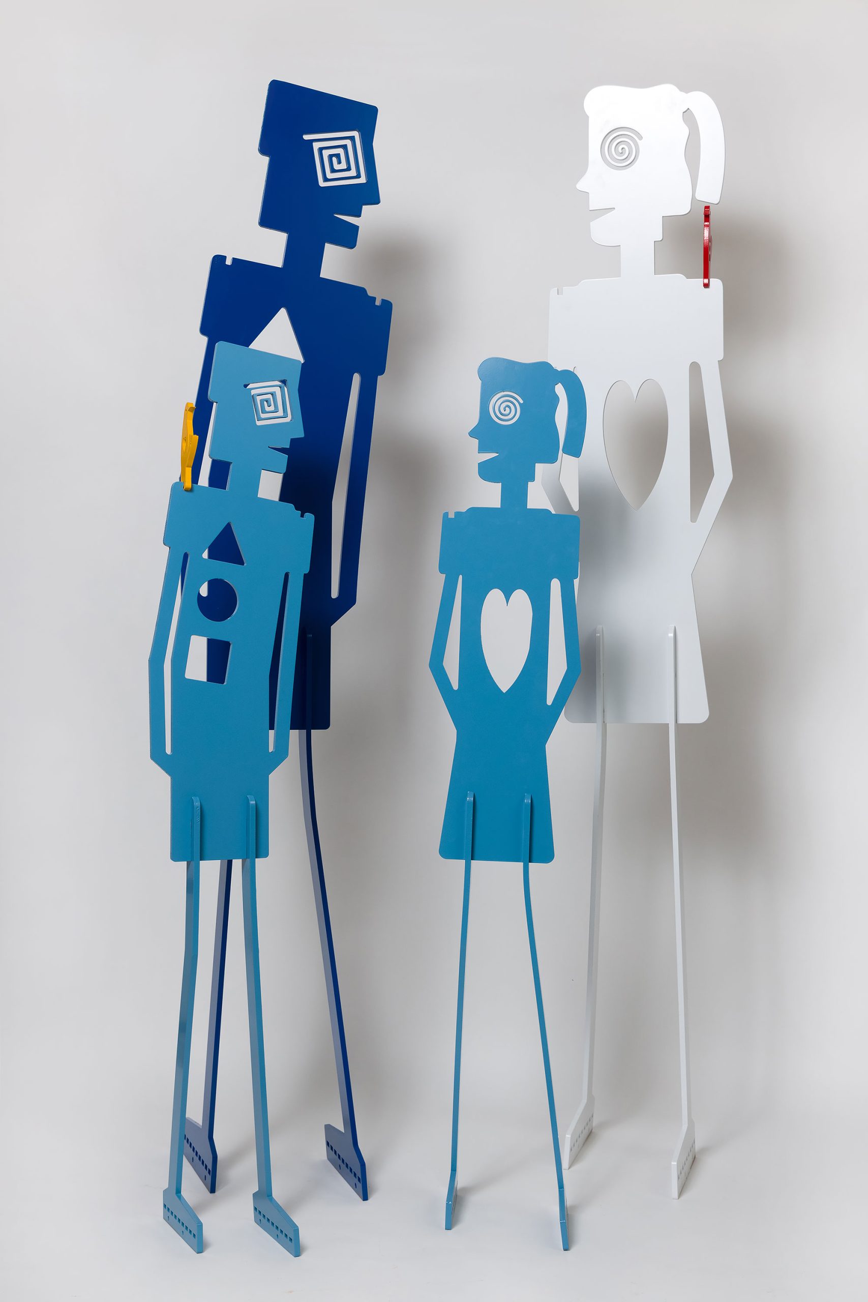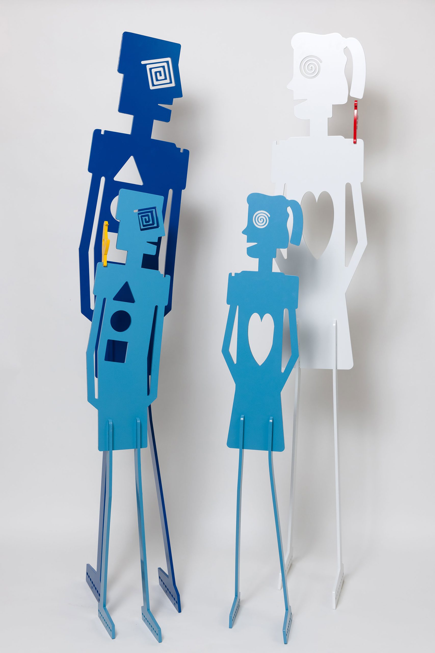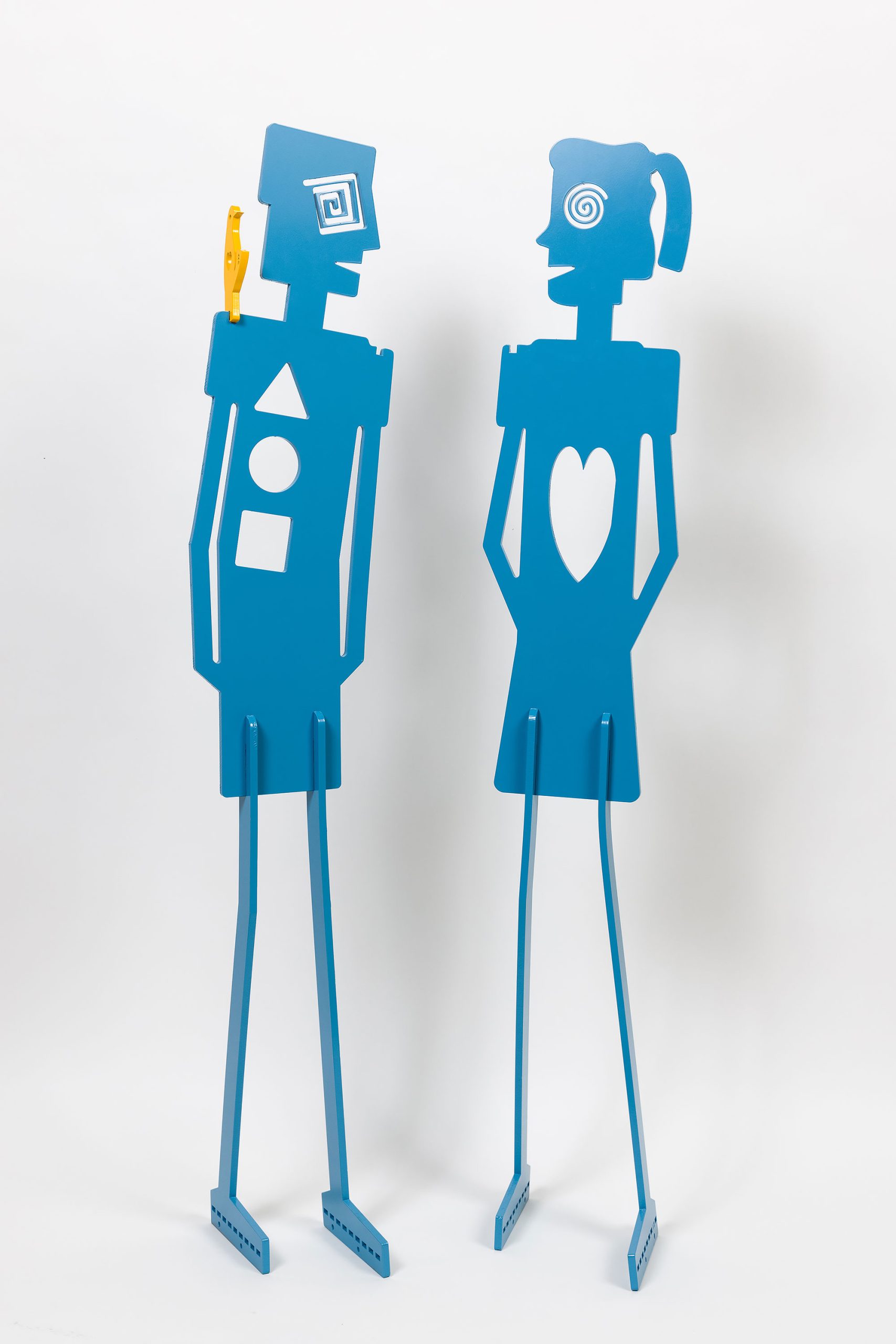 A striking and unique 3D sculpture titled ‘Boy & Girl’, crafted with original automobile colors on aluminum. Making them suitable for both indoor and outdoor display. This artwork is a fusion of pop art and modern art influences, drawing inspiration from the Bauhaus movement, pop art icons, and ancient scripts. This piece reflects the artist distinctive style and storytelling passion, bridging the past and present, making it a special and exciting addition to any collection.