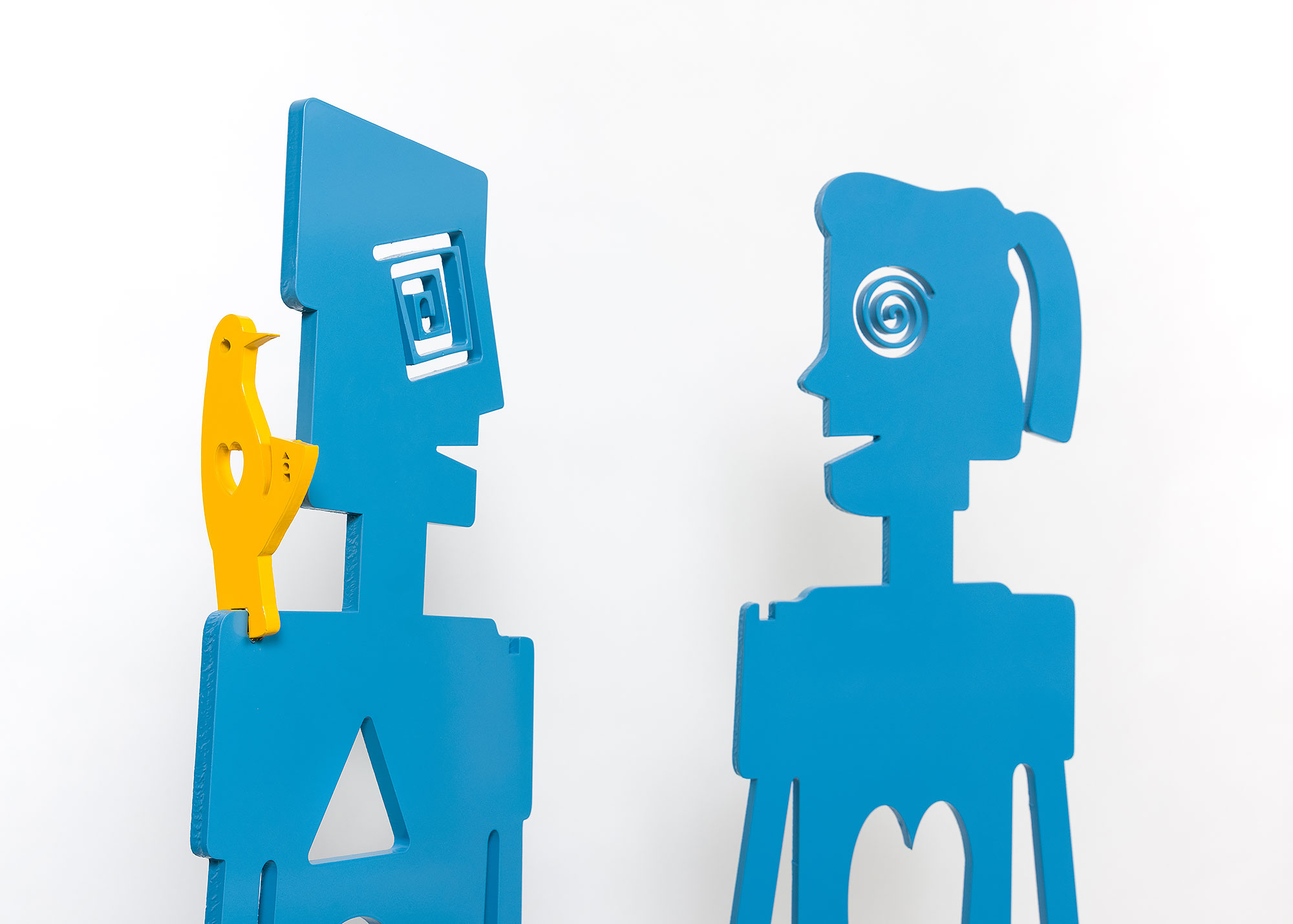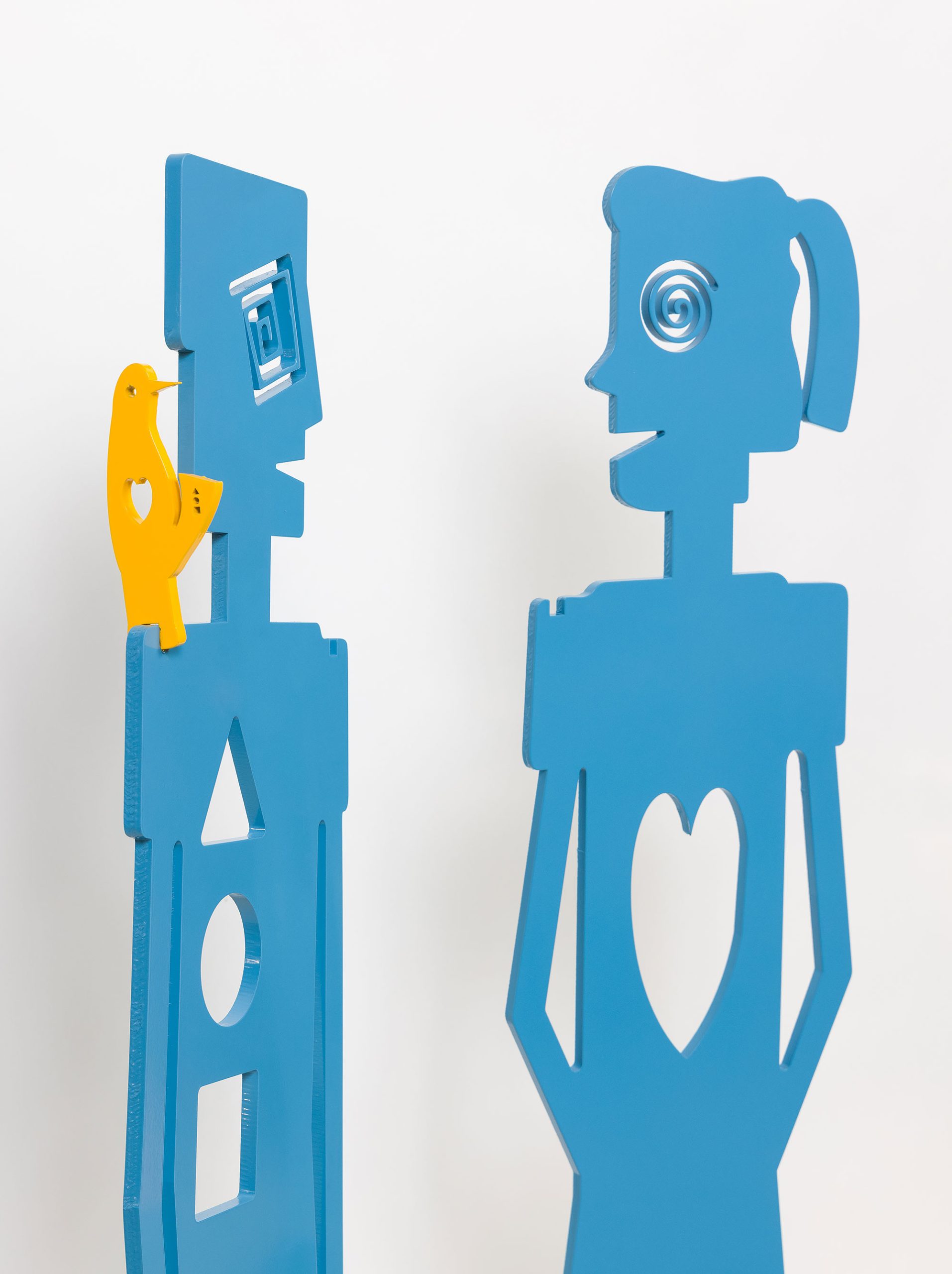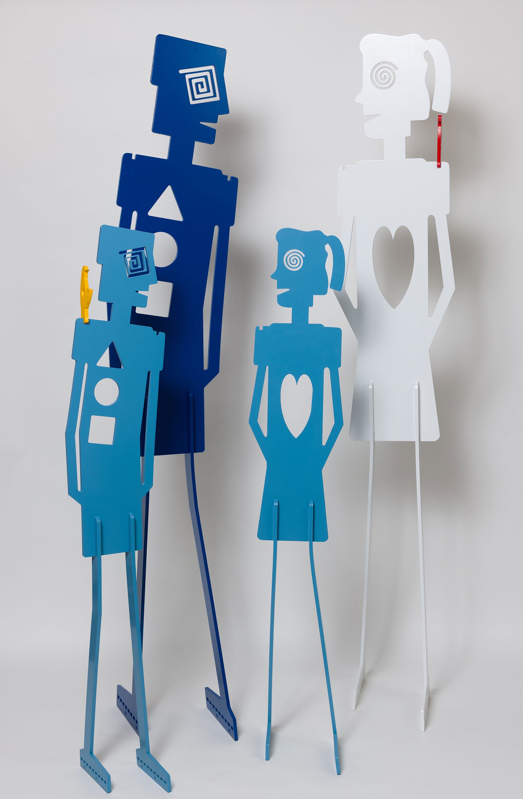 A striking and unique 3D sculpture titled ‘Boy & Girl’, crafted with original automobile colors on aluminum. Making them suitable for both indoor and outdoor display. This artwork is a fusion of pop art and modern art influences, drawing inspiration from the Bauhaus movement, pop art icons, and ancient scripts. This piece reflects the artist distinctive style and storytelling passion, bridging the past and present, making it a special and exciting addition to any collection.