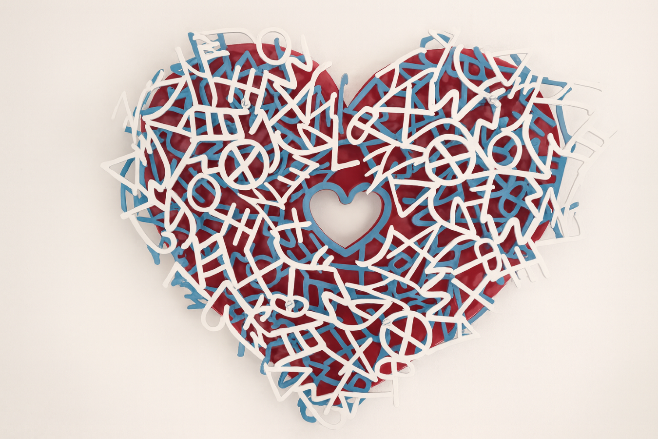 A contemporary three-dimensional wall sculpture inspired by the Song of Songs and the visual rhythm of the ancient Hebrew alphabet. The artwork is composed of layered aluminum forms coated with original automobile colors, creating depth, movement, and a harmonious circular composition. The intertwining characters evoke themes of love, unity, and poetic expression, reflecting the timeless spirit of the biblical text through modern artistic language.