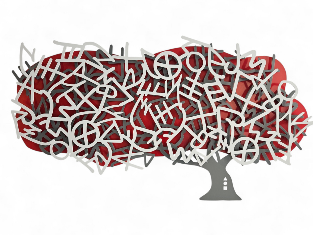 Tree of Life is a dynamic three-dimensional wall sculpture composed of interwoven forms inspired by the ancient Hebrew alphabet. Precision-cut aluminum elements, finished with original automobile colors, create layers of movement and rhythm that evoke growth, continuity, and spiritual vitality.