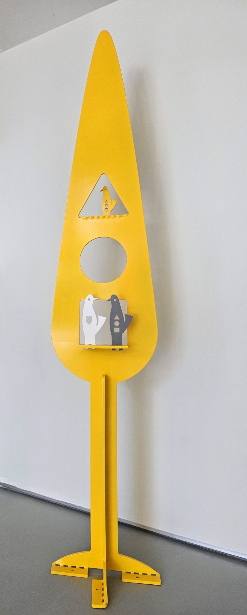 This yellow totem-like piece evokes both the essence of a tree and the spirit of renewal. Perched within its bold, stylized form are minimalist bird figures—guardians of memory, perched in unity and hope. The clean lines and bright palette echo Zion Ezri’s deep connection to Bauhaus aesthetics, pop art vibrancy, and urban sculpture.