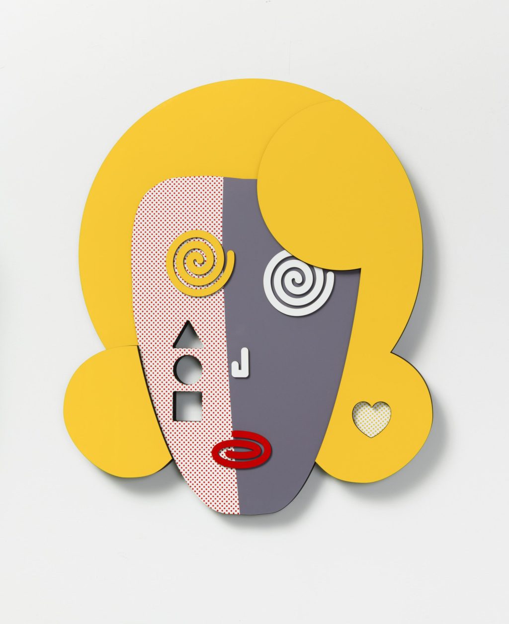 Blending Modern Design, Pop Art, and Bauhaus influences, the artwork features bold shapes and a rich shiny color mix of yellow, gray, red, and more.