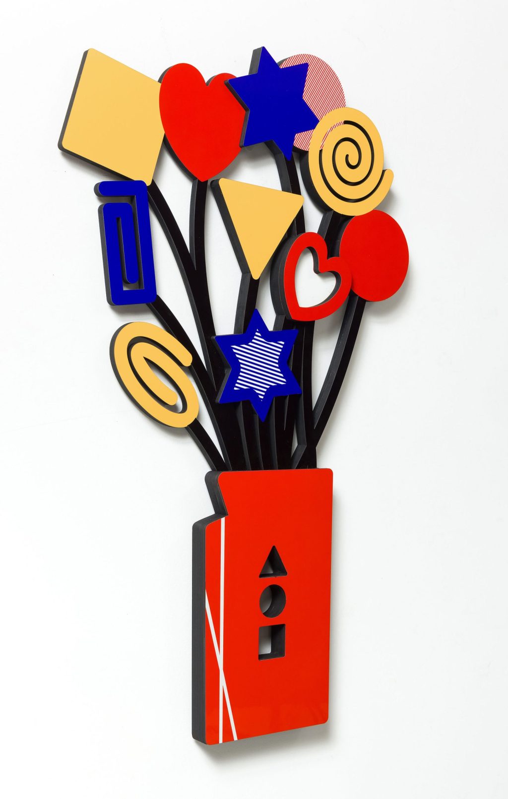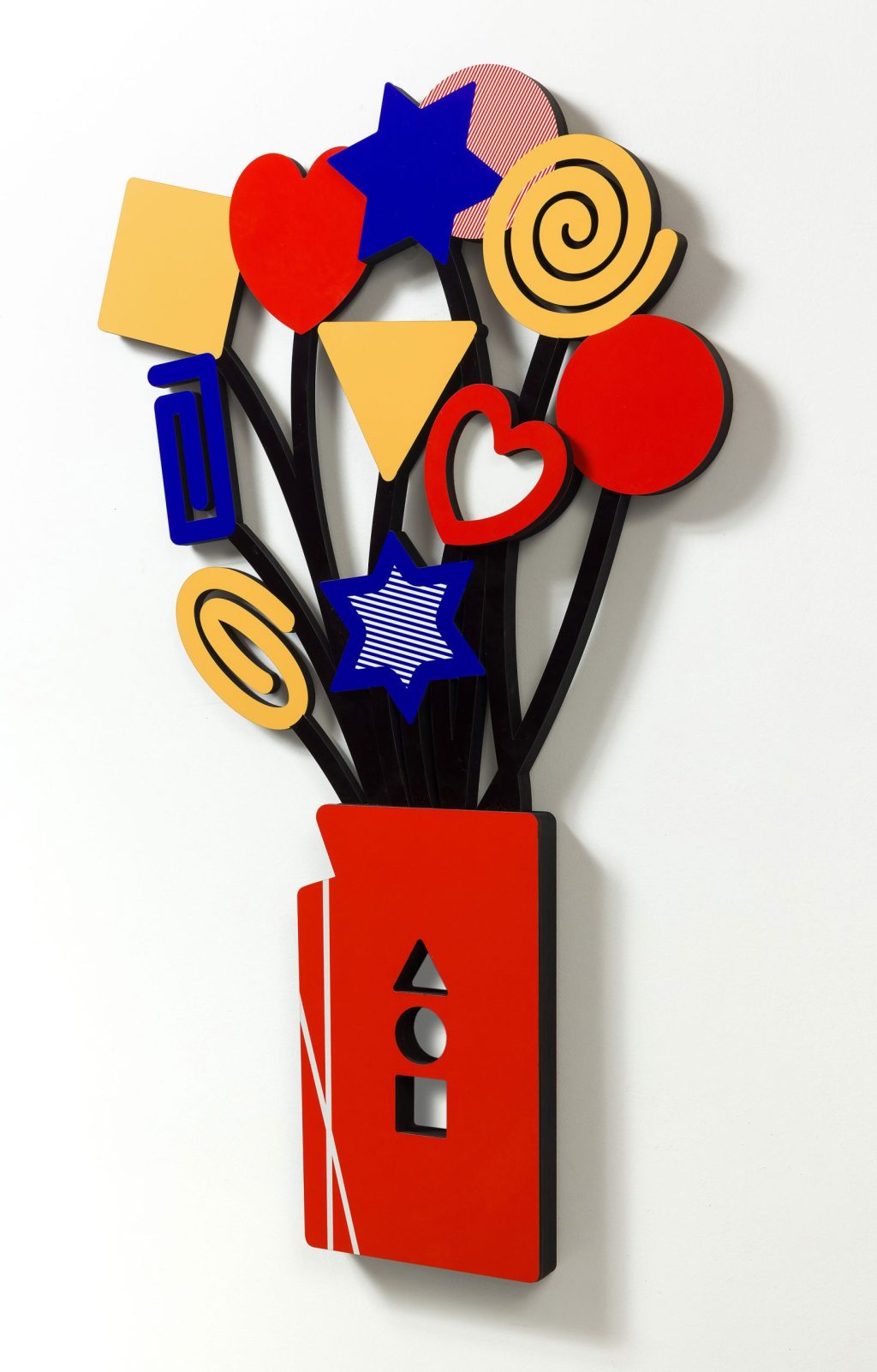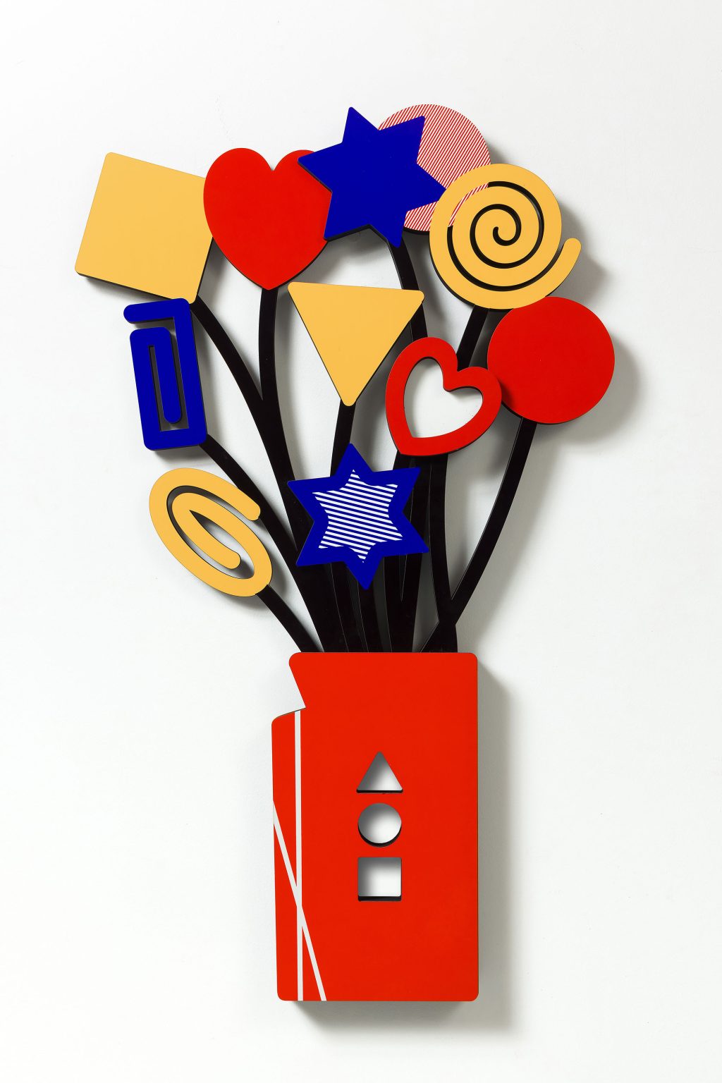 Big Red Flowers – A striking 3D mixed media wall sculpture, blending vibrant layers of prints with geometric shapes like Star of David, hearts, stars, and spirals. Inspired by Bauhaus and pop art, this 100×60 cm (39×24 in) piece captures bold reds, blues, and yellows, reflecting the energy of life in Israel. Perfect for collectors seeking unique, modern statement pieces.
